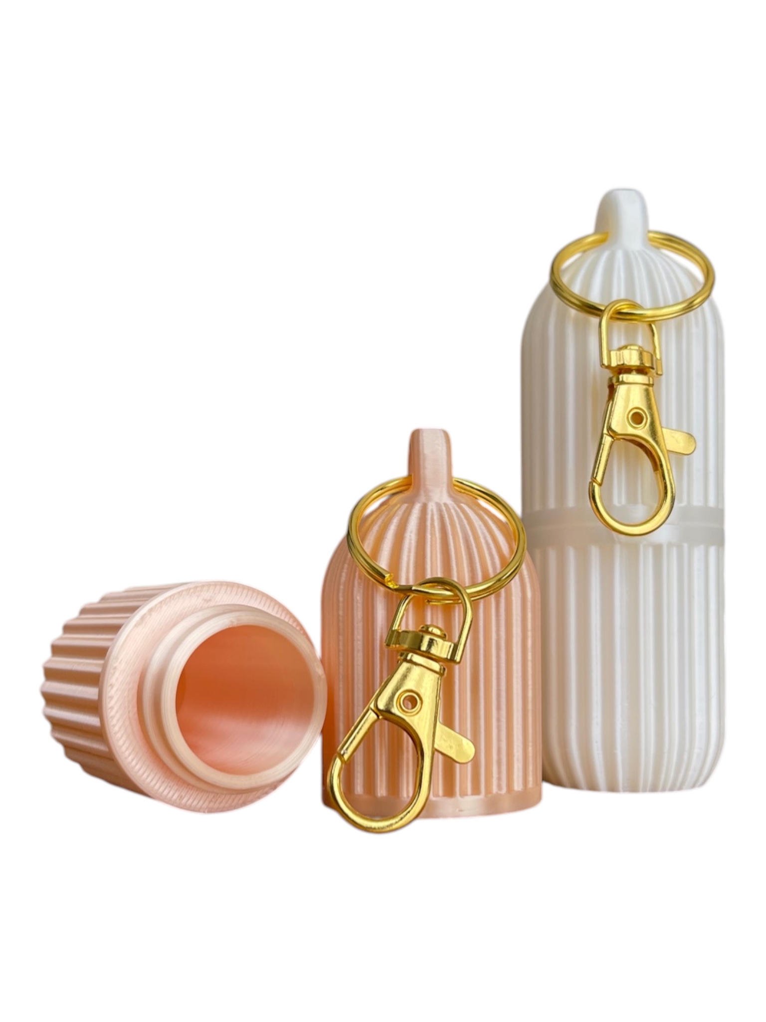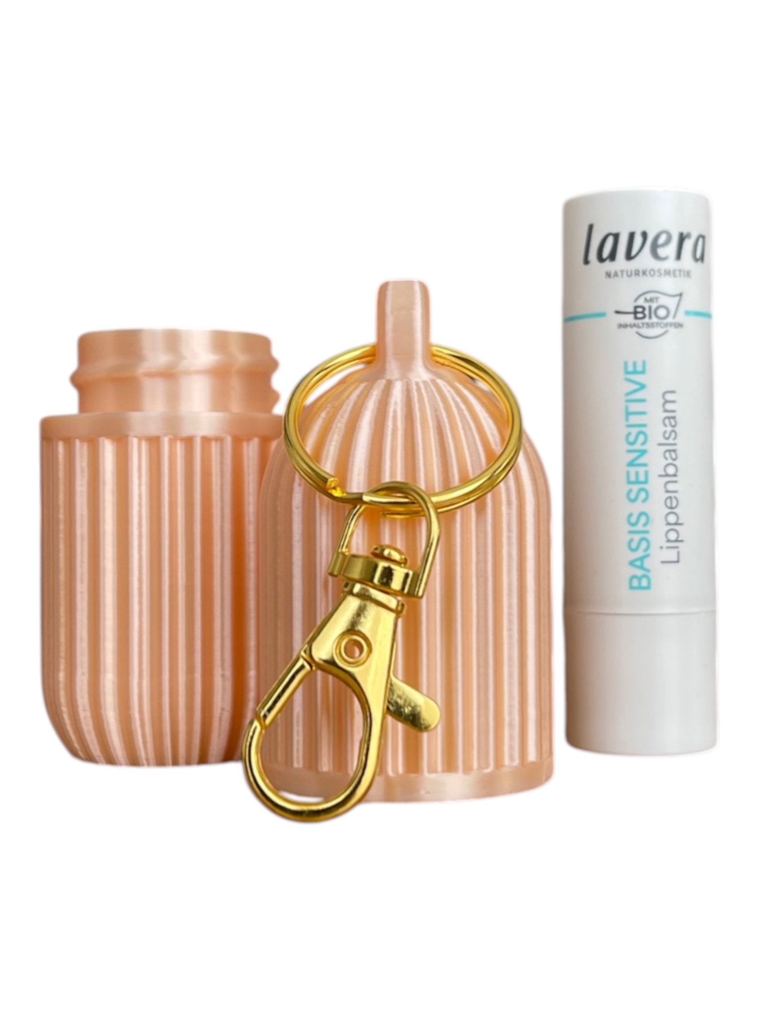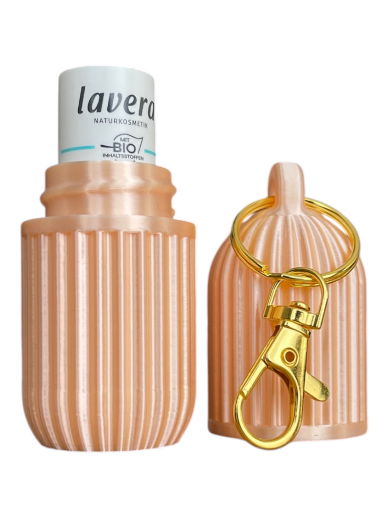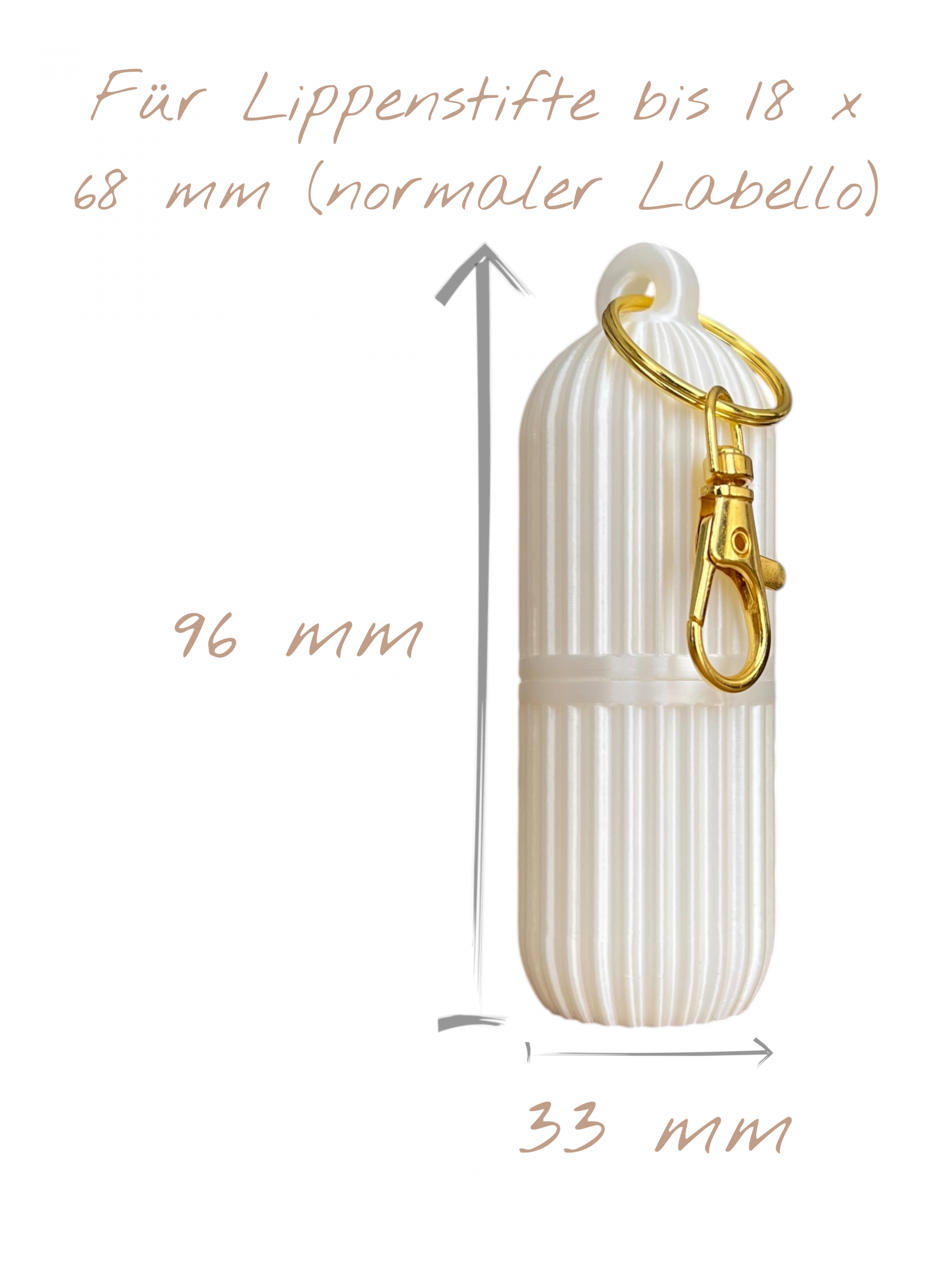Dieses elegante Lippenstiftetui mit Schlüsselanhänger ist der perfekte Begleiter für unterwegs. Die geriffelte Hülle schützt Ihren Lippenbalsam zuverlässig vor Beschädigungen und hält ihn jederzeit griffbereit. Das stilvolle Design in Champagner und Weiß seidenglanz verleiht diesem praktischen Accessoire eine edle Note, die zu jedem Outfit passt. Der robuste Schlüsselanhänger mit goldfarbenem Karabinerhaken ermöglicht es Ihnen, das Etui sicher an Ihrer Tasche, Ihrem Schlüsselbund oder Rucksack zu befestigen, sodass Sie Ihren Lippenpflegestift nie wieder suchen müssen. Die kompakte Größe macht es ideal für die Handtasche, den Rucksack oder als praktisches Reiseaccessoire. Das Etui lässt sich durch die Schraubverschluss-Konstruktion einfach öffnen und schließen, während es Ihren Lippenbalsam sicher aufbewahrt. Ein durchdachtes und zugleich dekoratives Accessoire für alle, die Wert auf Organisation und Stil legen. Perfekt auch als kleines Geschenk für Freunde und Familie!